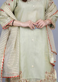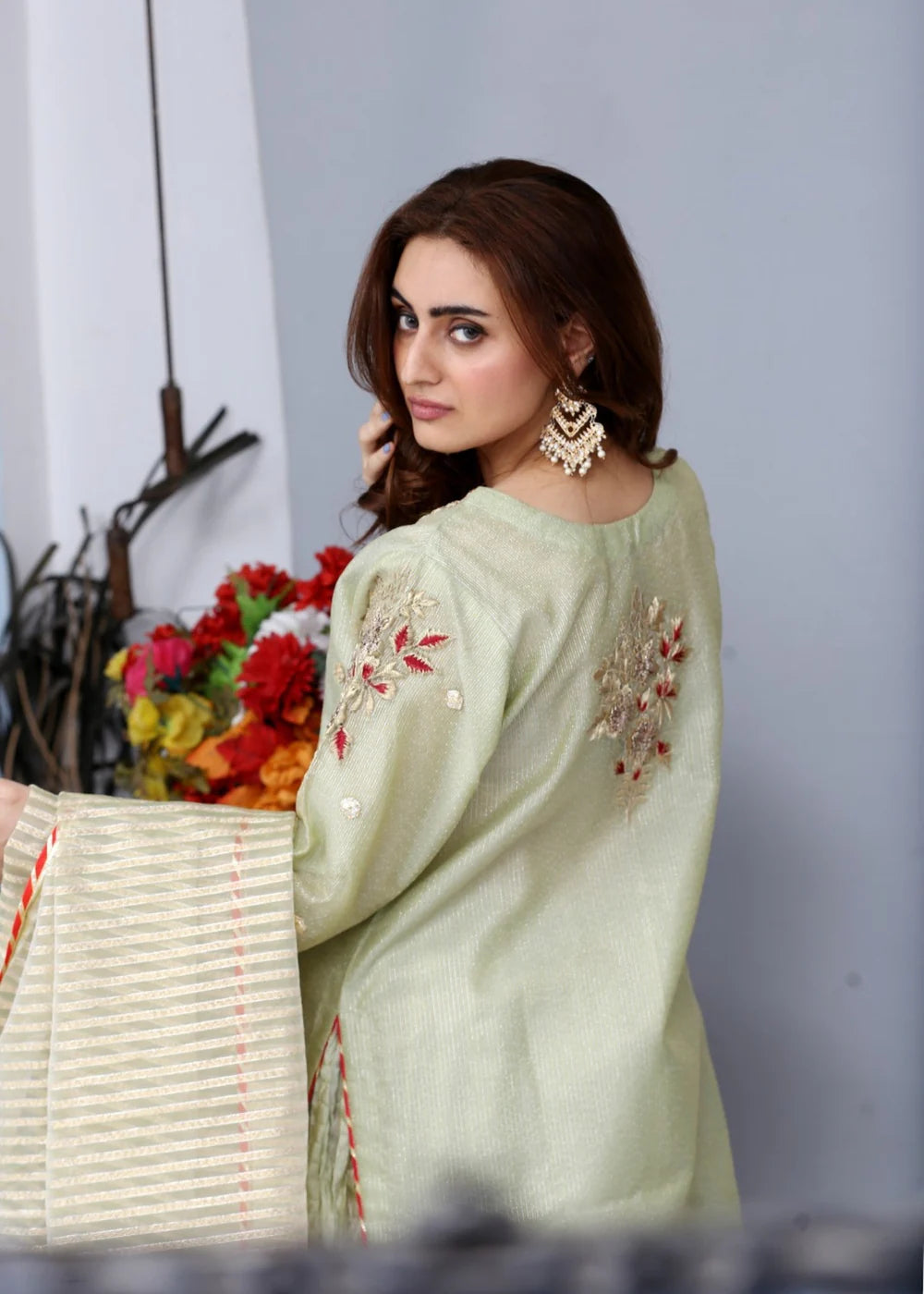 Elevate your festive and formal style with this exquisite handmade design in soft pista color. The shirt features intricate hand embroidery on both the front and back, showcasing timeless craftsmanship and attention to detail. Crafted from luxurious Safrina fabric, this ensemble includes a beautifully coordinated dupatta and Sharara trouser, adding elegance and charm to every occasion.