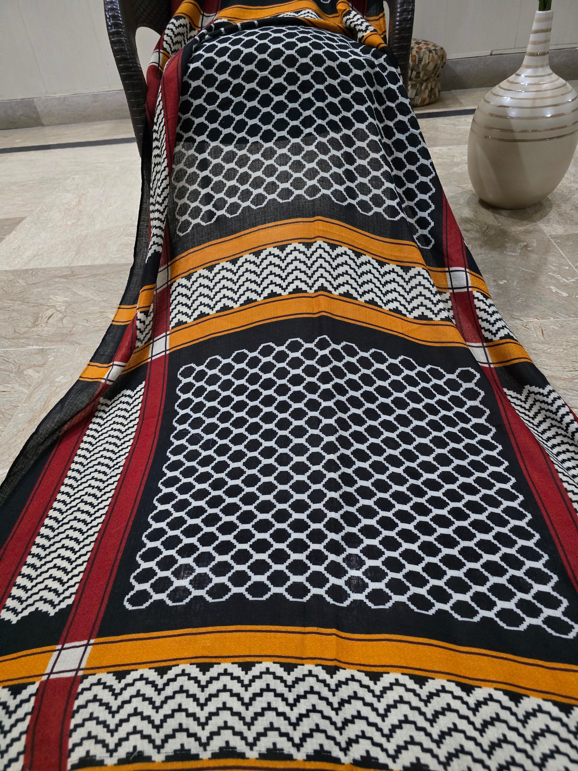 Crafted from a premium Fabric blend, this scarf features a beautifully detailed woven design in rich, multi-coloured motifs. Its bigger size allows for easy draping and versatile styling — perfect for both casual and formal occasions. The fabric is lightweight yet warm, making it ideal for all seasons, offering a graceful touch whether worn during breezy evenings or cool winter days.