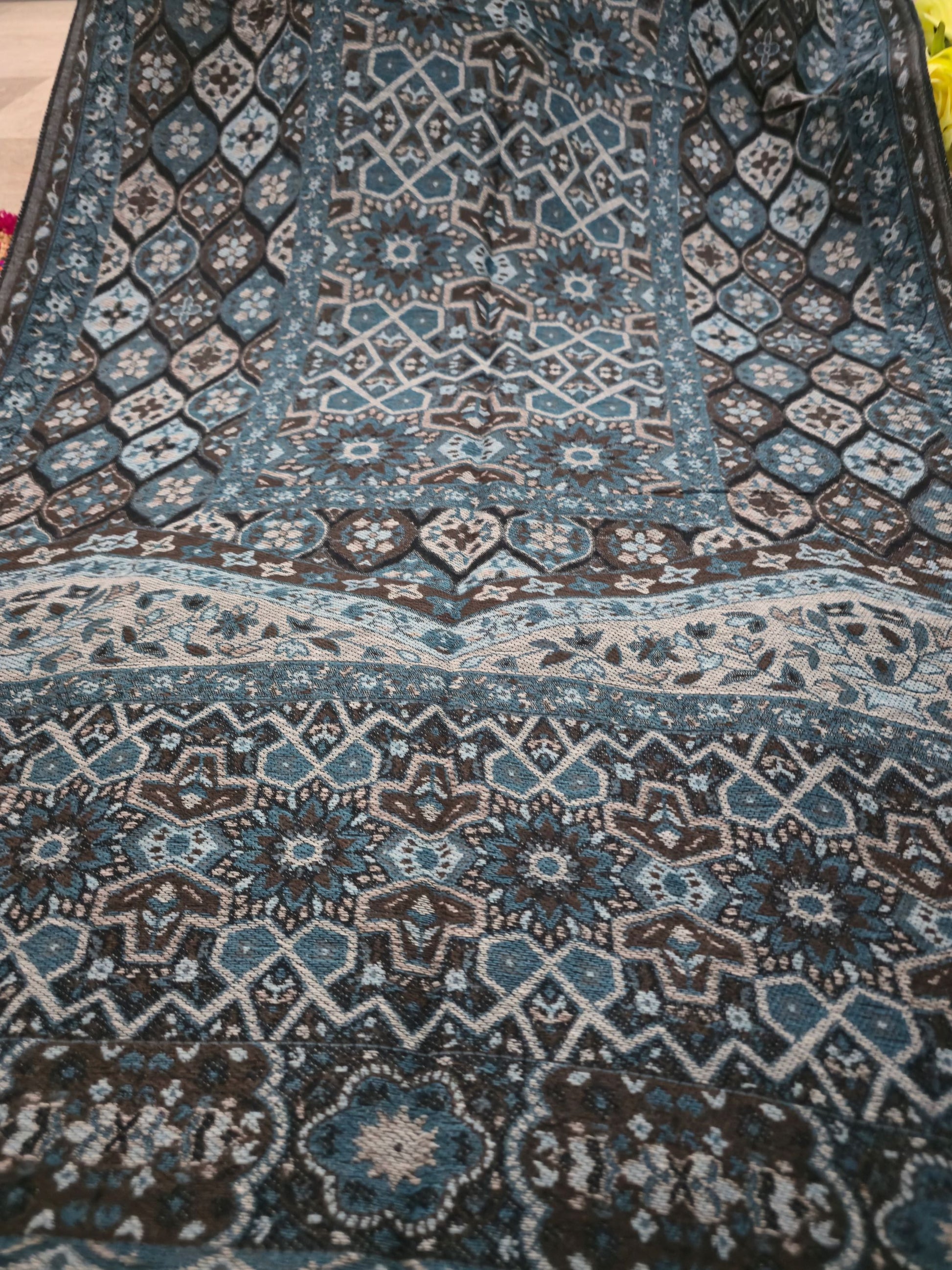 Crafted from a premium pashmina blend, this scarf features a beautifully detailed woven design in rich, multi-coloured motifs. Its bigger size allows for easy draping and versatile styling — perfect for both casual and formal occasions. The fabric is lightweight yet warm, making it ideal for all seasons, offering a graceful touch whether worn during breezy evenings or cool winter days.