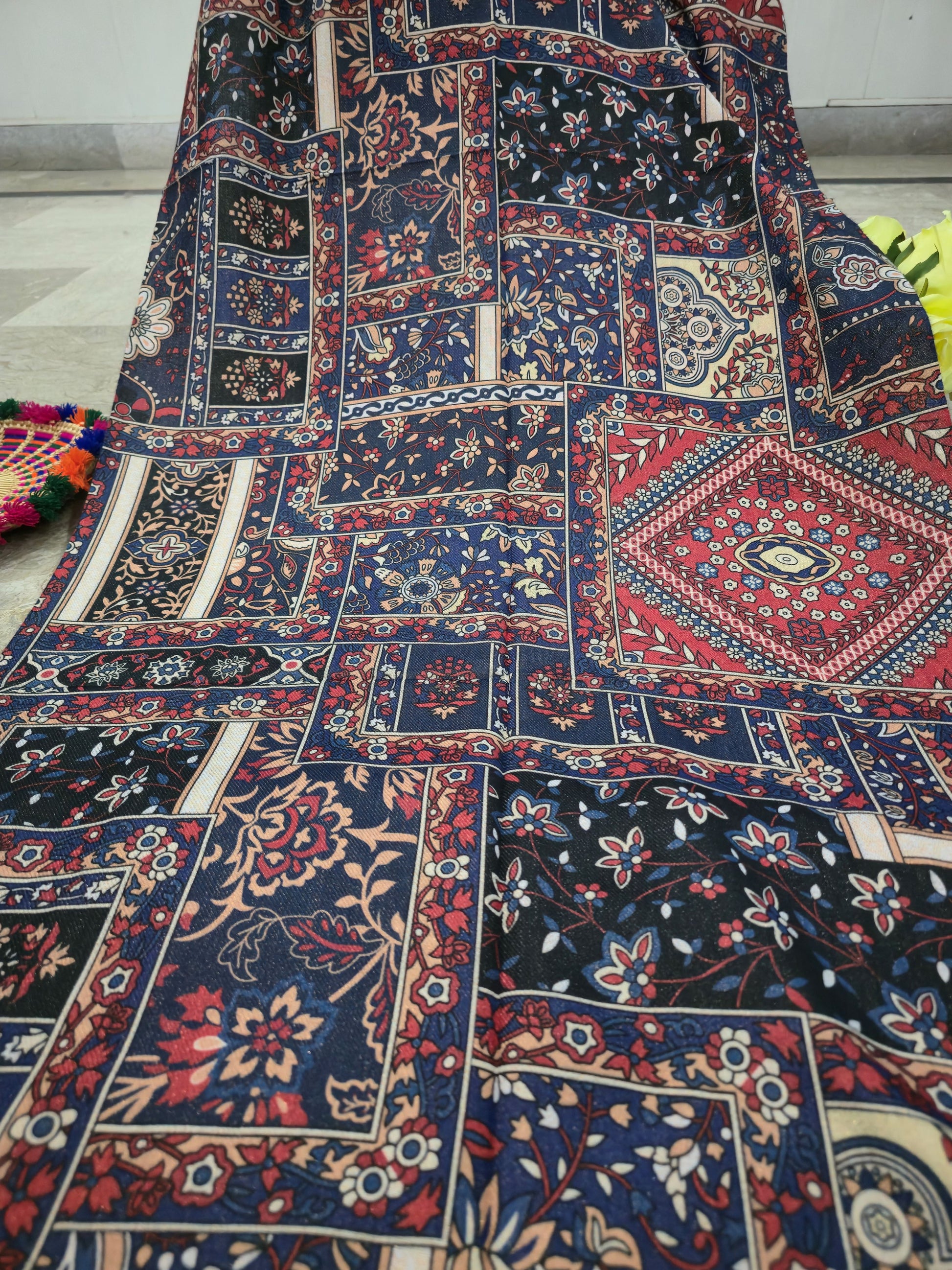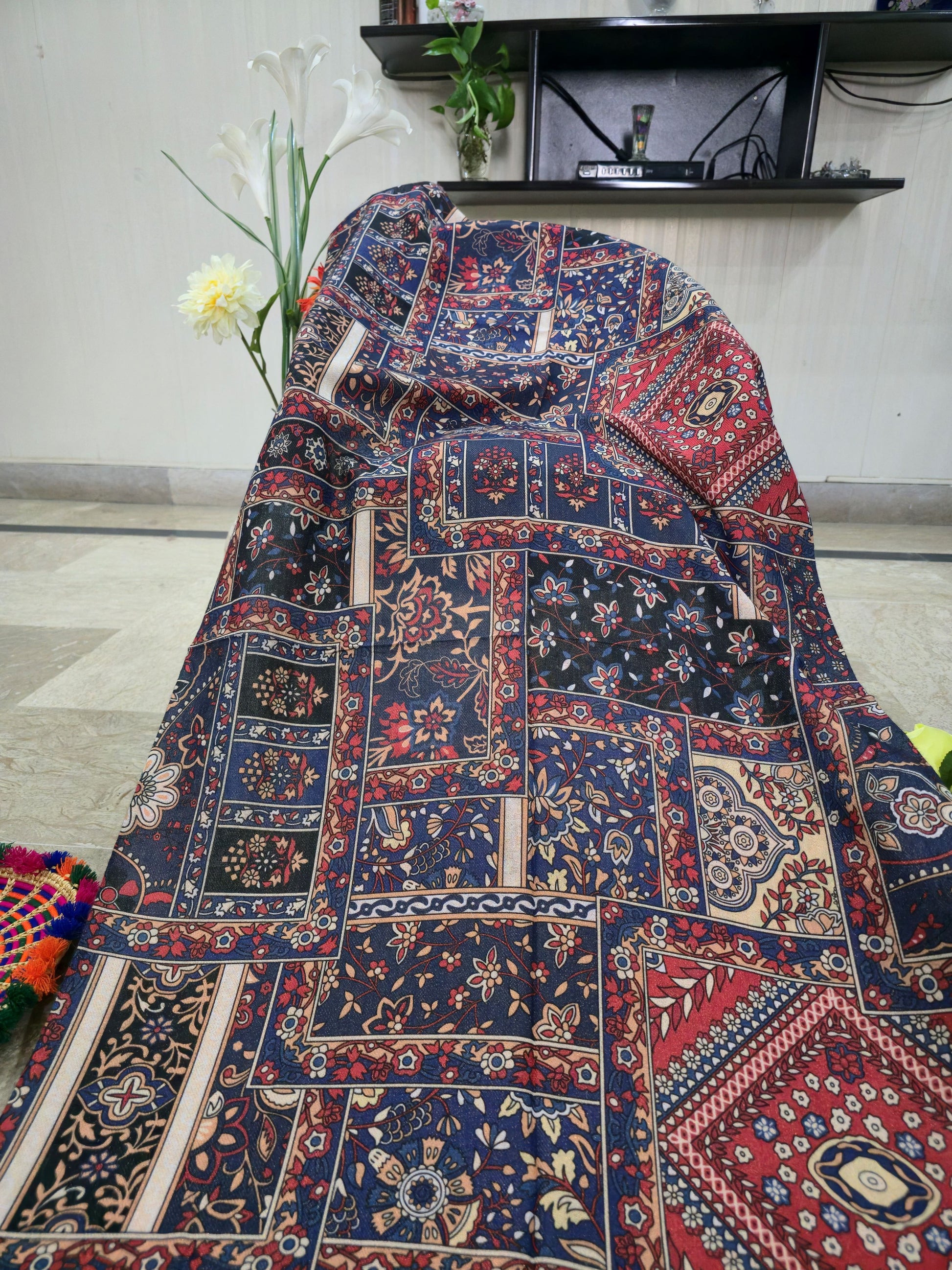 Crafted from a premium pashmina blend, this scarf features a beautifully detailed woven design in rich, multi-coloured motifs. Its bigger size allows for easy draping and versatile styling — perfect for both casual and formal occasions. The fabric is lightweight yet warm, making it ideal for all seasons, offering a graceful touch whether worn during breezy evenings or cool winter days.