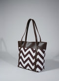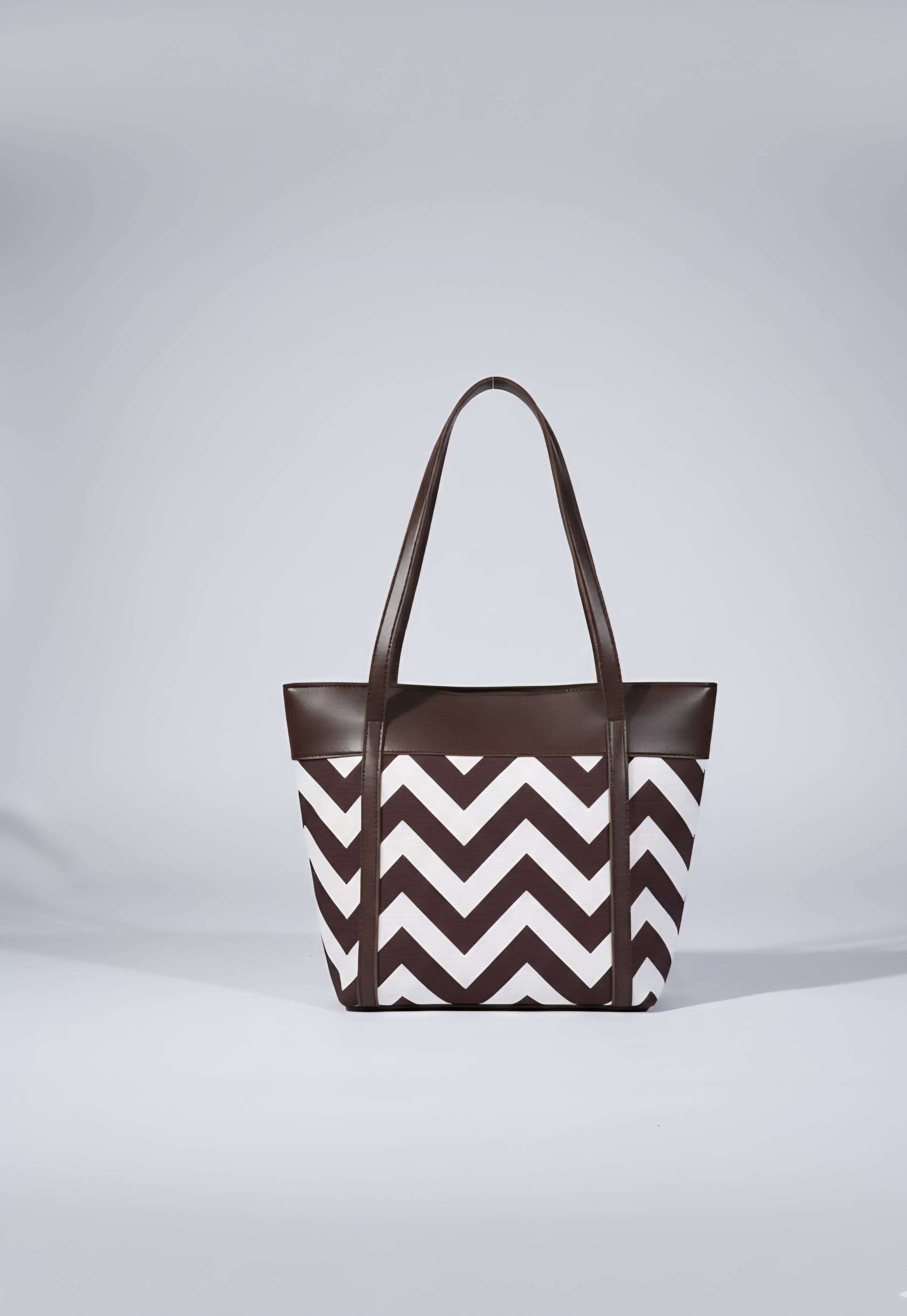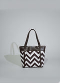 The bold, high-contrast brown and white chevron print is beautifully complemented by rich faux trim and sturdy shoulder straps. It's spacious enough to carry your daily essentials—from a tablet and notebook to your makeup bag—while the classic tote silhouette ensures you look polished for any occasion.
