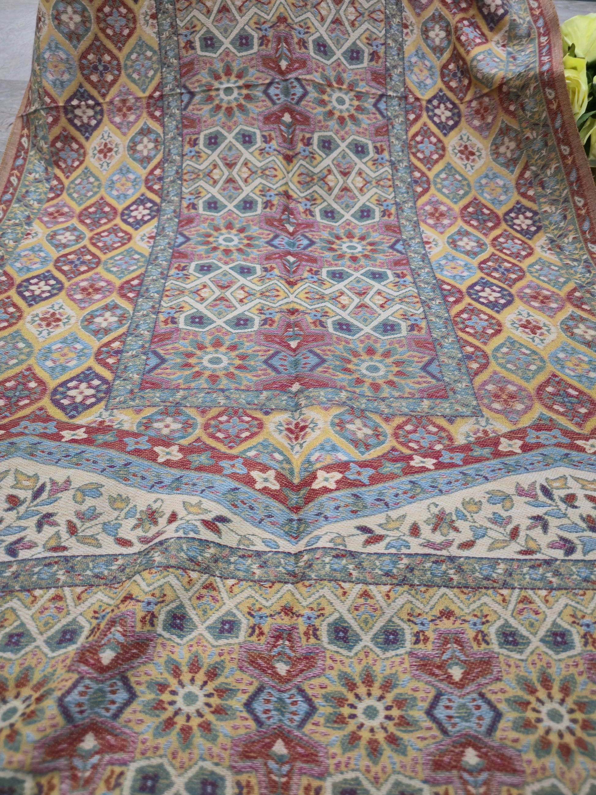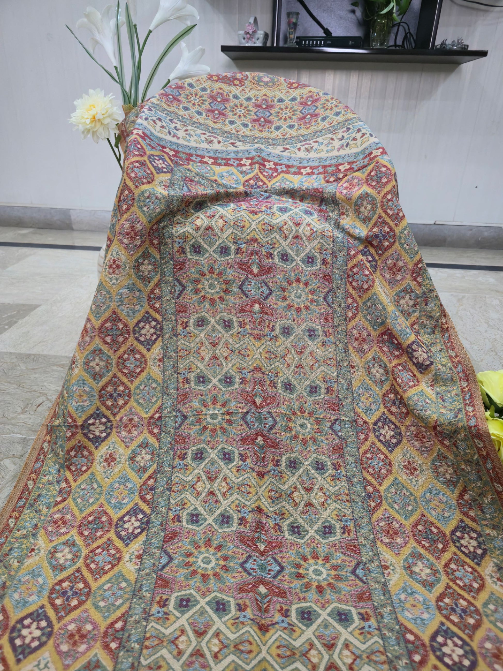 Crafted from a premium pashmina blend, this scarf features a beautifully detailed woven design in rich, multicolored motifs. Its bigger size allows for easy draping and versatile styling — perfect for both casual and formal occasions. The fabric is lightweight yet warm, making it ideal for all seasons, offering a graceful touch whether worn during breezy evenings or cool winter days.
