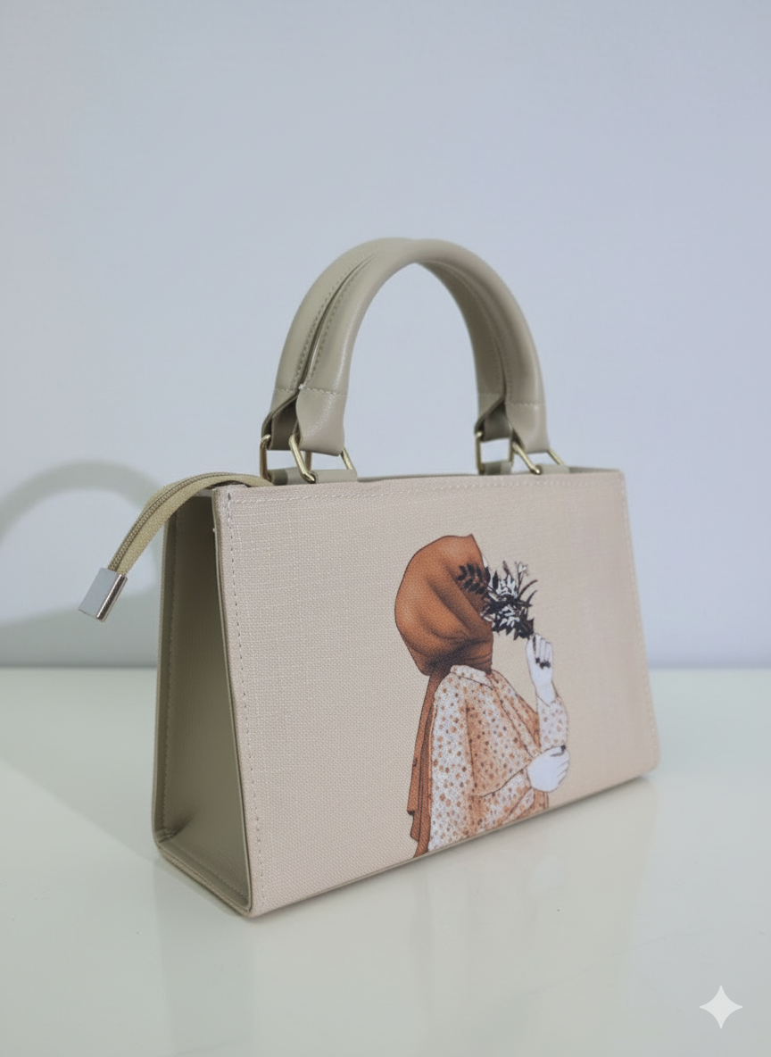 Distinctive Graphic Print: The main panel features an elegant artistic illustration of a woman in a Grey hijab holding a bouquet, adding a deeply personal and stylish cultural touch.