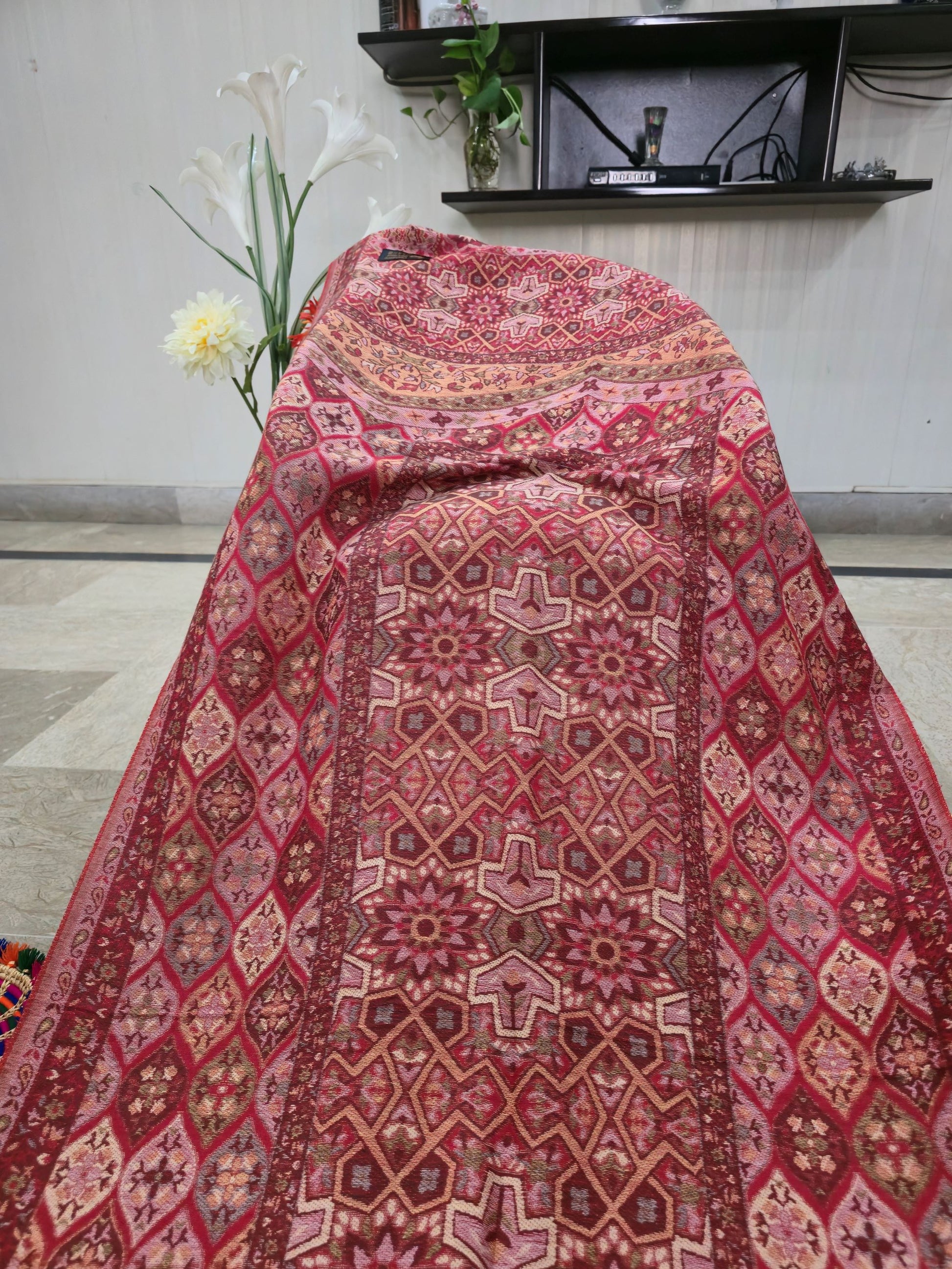 Crafted from a premium pashmina blend, this scarf features a beautifully detailed woven design in rich, multi-coloured motifs. Its bigger size allows for easy draping and versatile styling — perfect for both casual and formal occasions. The fabric is lightweight yet warm, making it ideal for all seasons, offering a graceful touch whether worn during breezy evenings or cool winter days.