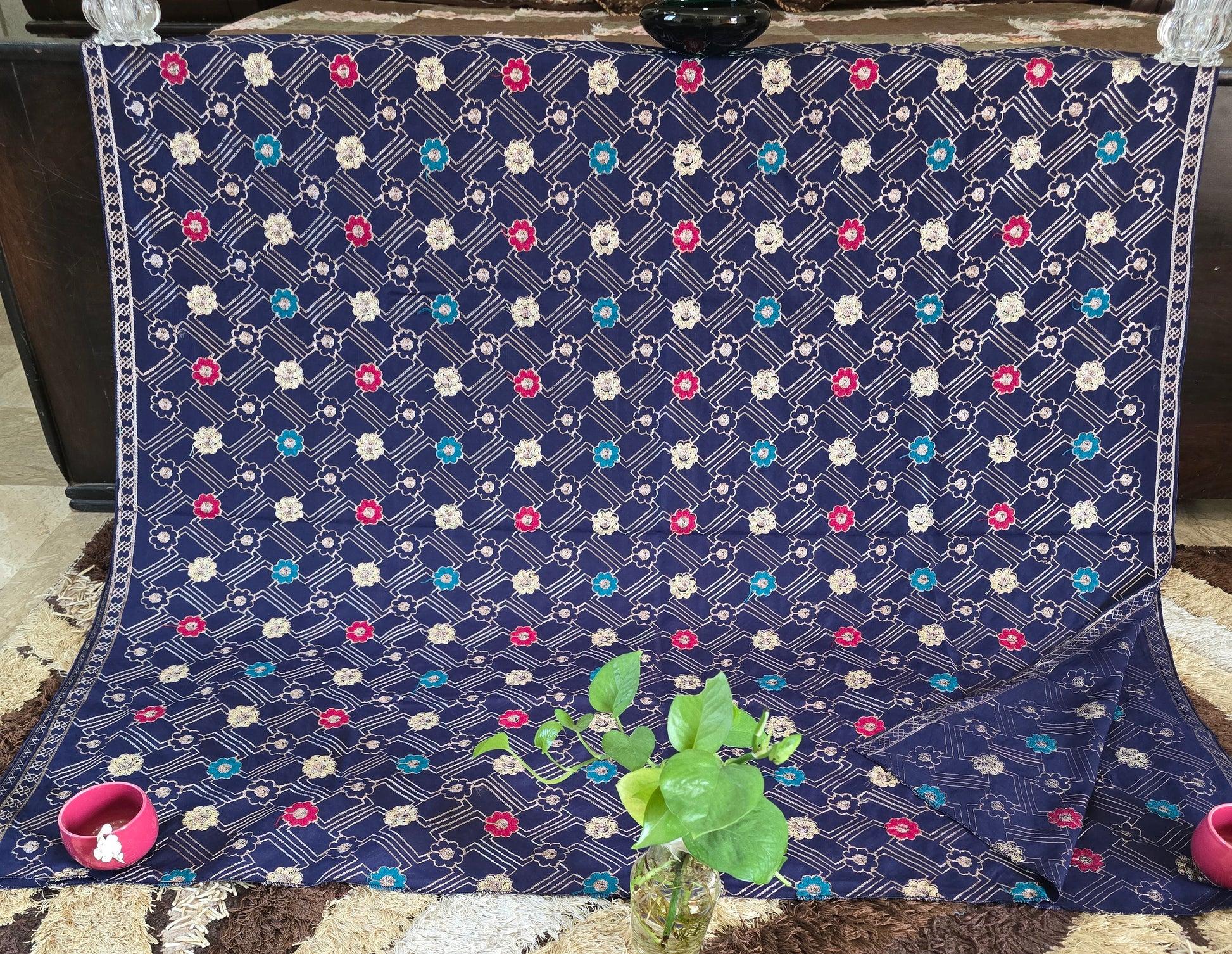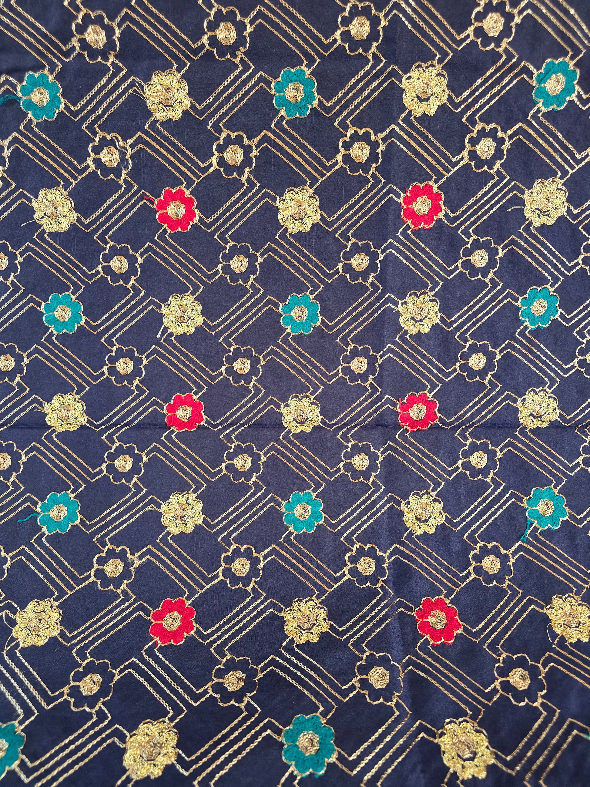 The rich base is beautifully adorned with delicate embroidery and finished with a graceful border, giving it a timeless and sophisticated appeal.
