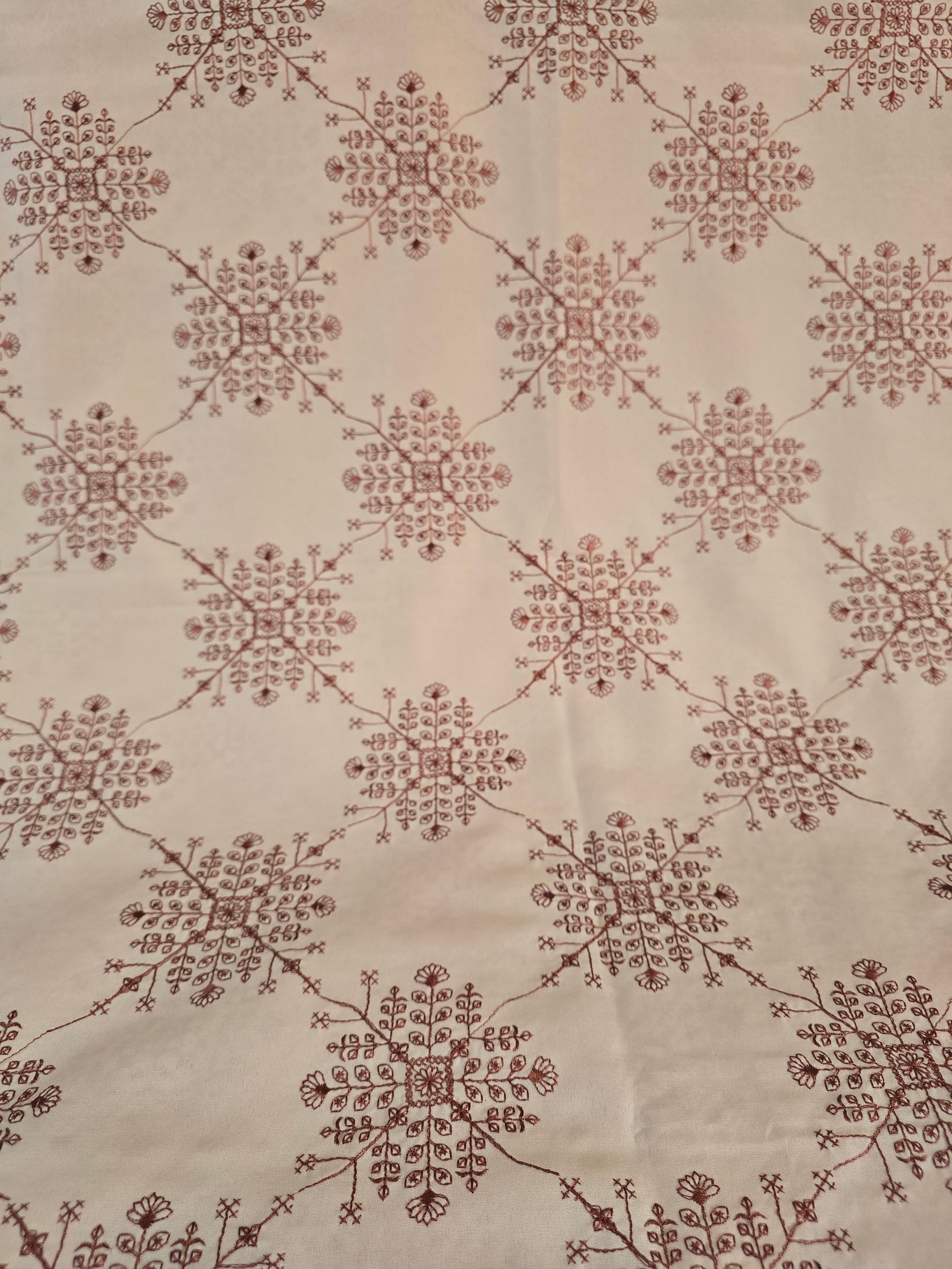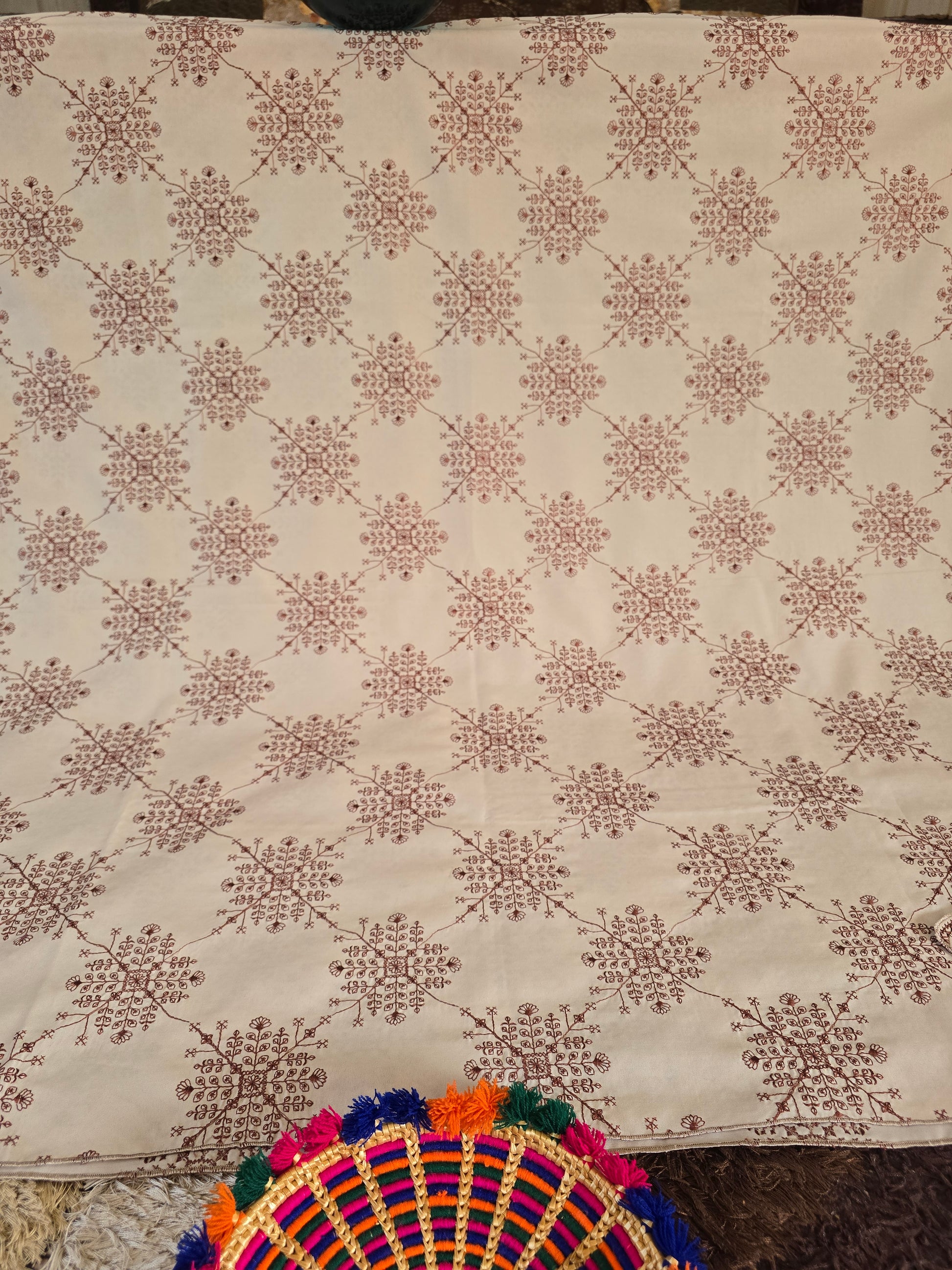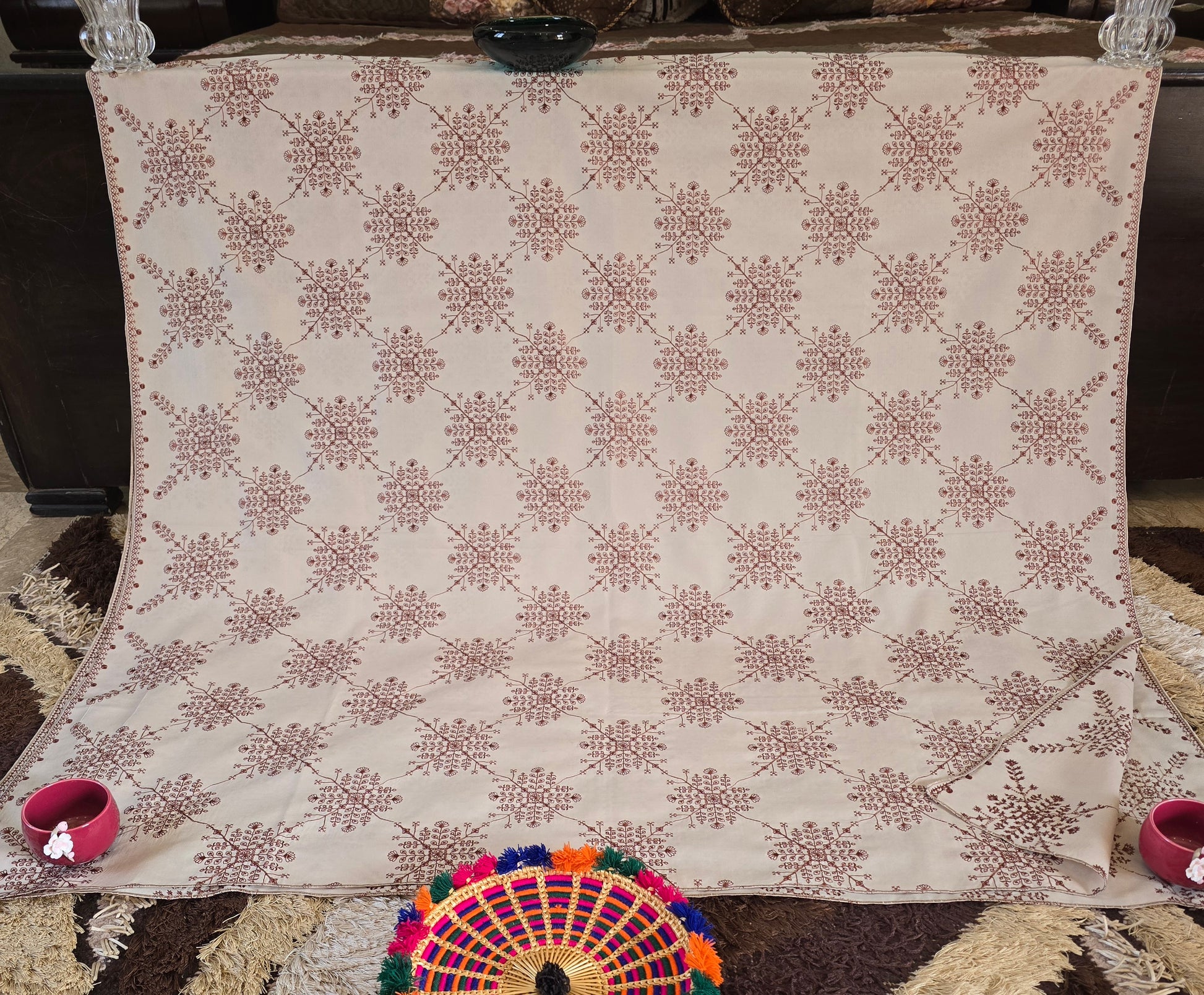 The rich base is beautifully adorned with delicate embroidery and finished with a graceful border, giving it a timeless and sophisticated appeal.