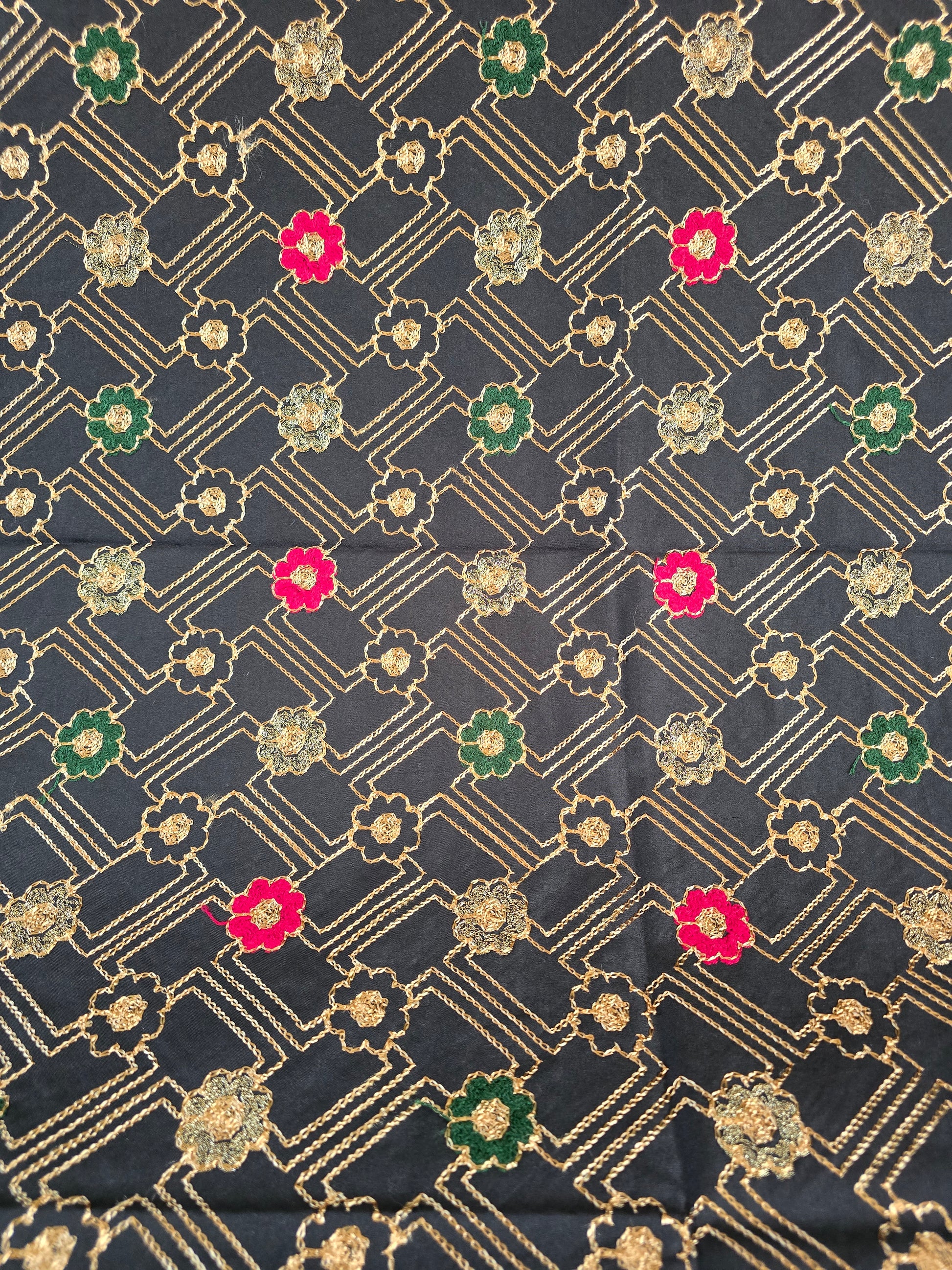 The rich base is beautifully adorned with delicate embroidery and finished with a graceful border, giving it a timeless and sophisticated appeal.