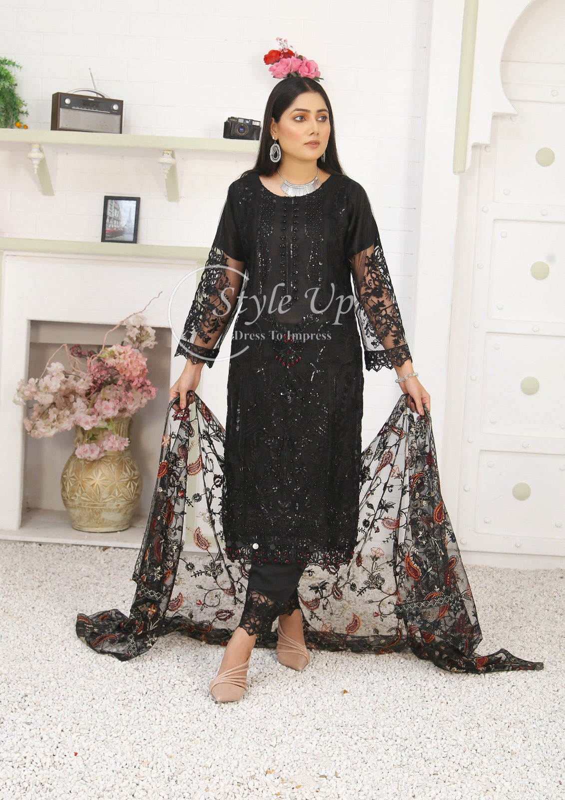 Elevate your festive and formal wardrobe with this stunning 3-piece embroidered ensemble by Style Up. Crafted from premium Bareeze net fabric, the shirt features exquisite embroidery on both the front and back, showcasing fine craftsmanship and attention to detail. The set is paired with a fully embroidered dupatta that adds an elegant touch, and a matching trouser that completes the graceful look.