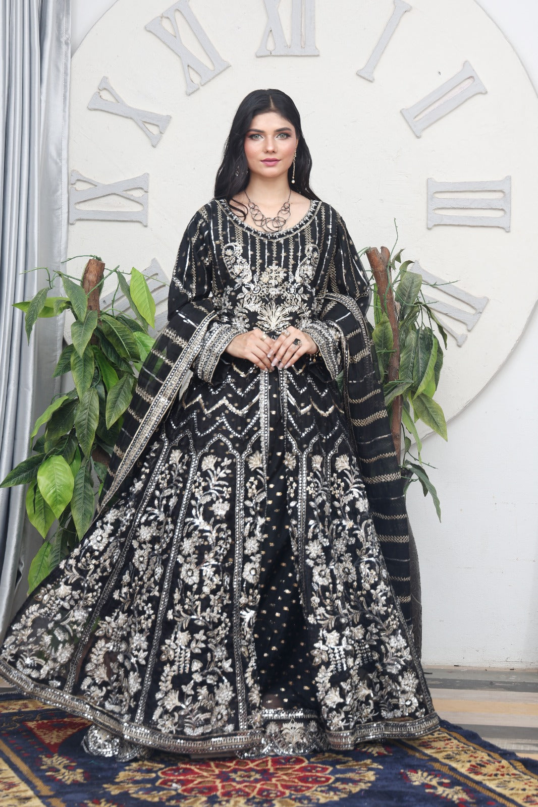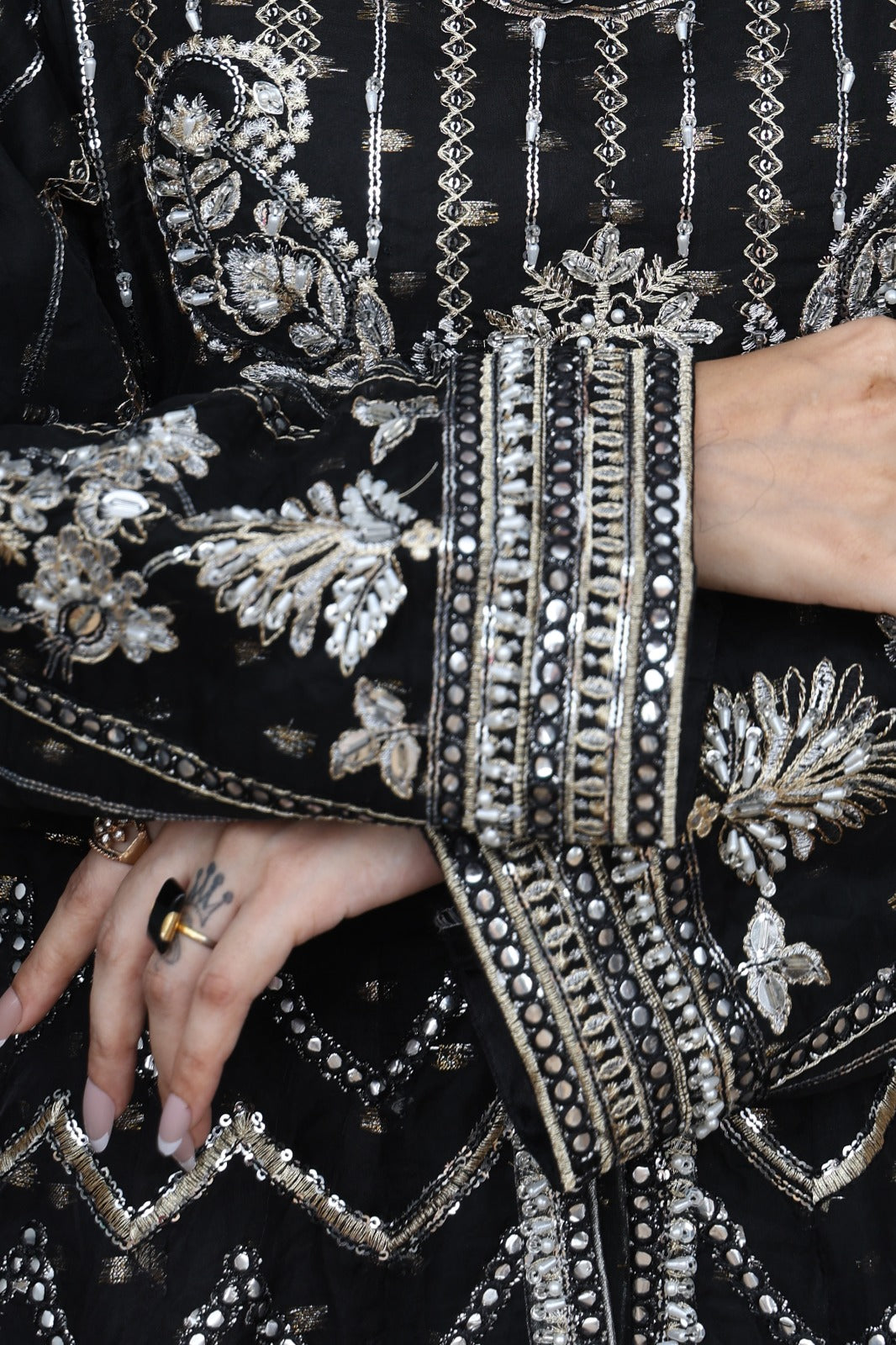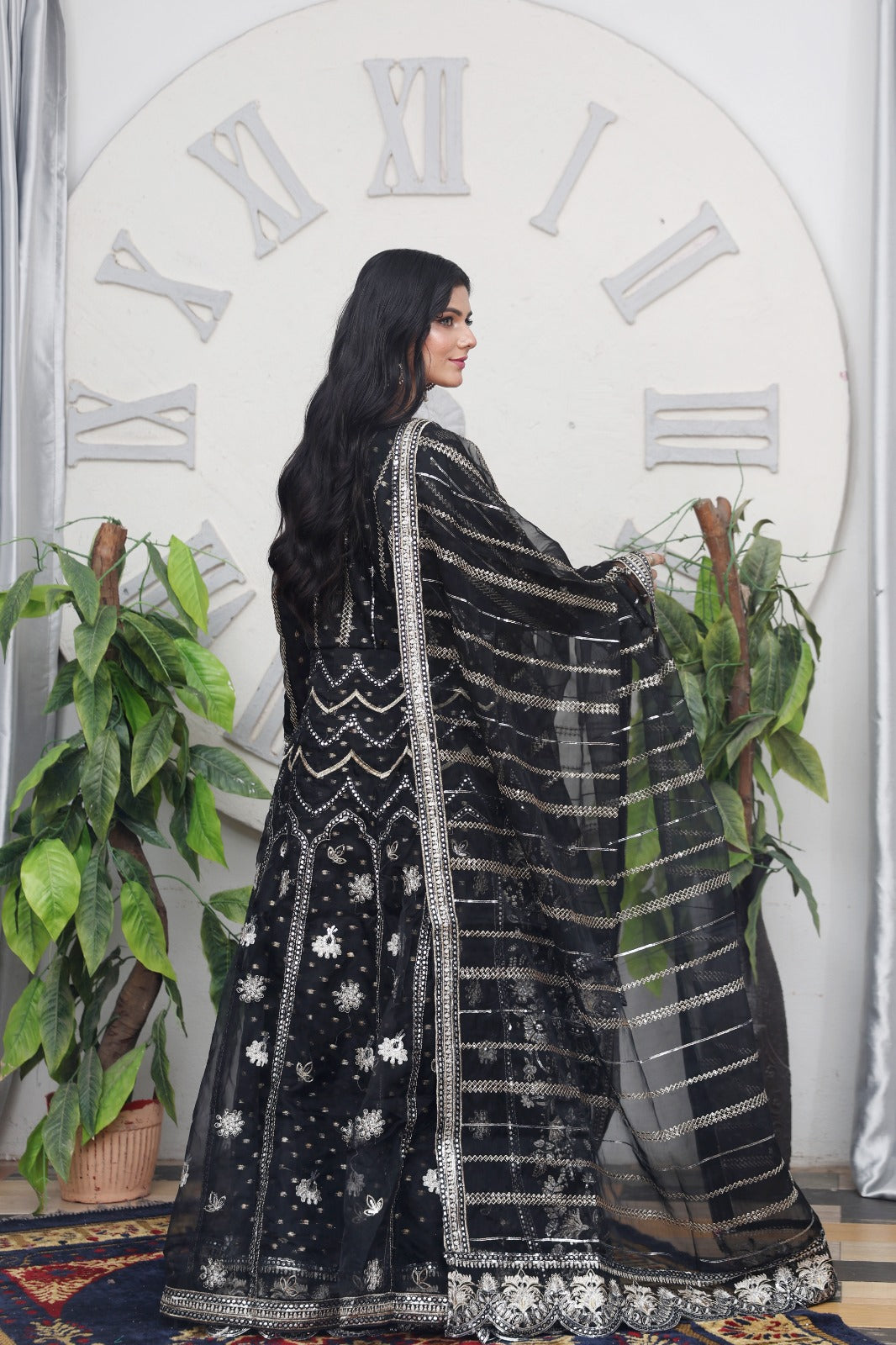 Make a statement with this elegant 3-piece black maxi set by Style Up, designed to turn every occasion into a celebration. Crafted from premium organza fabric, the outfit features intricate embroidery on both the front and back, showcasing timeless craftsmanship and festive elegance.