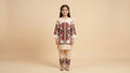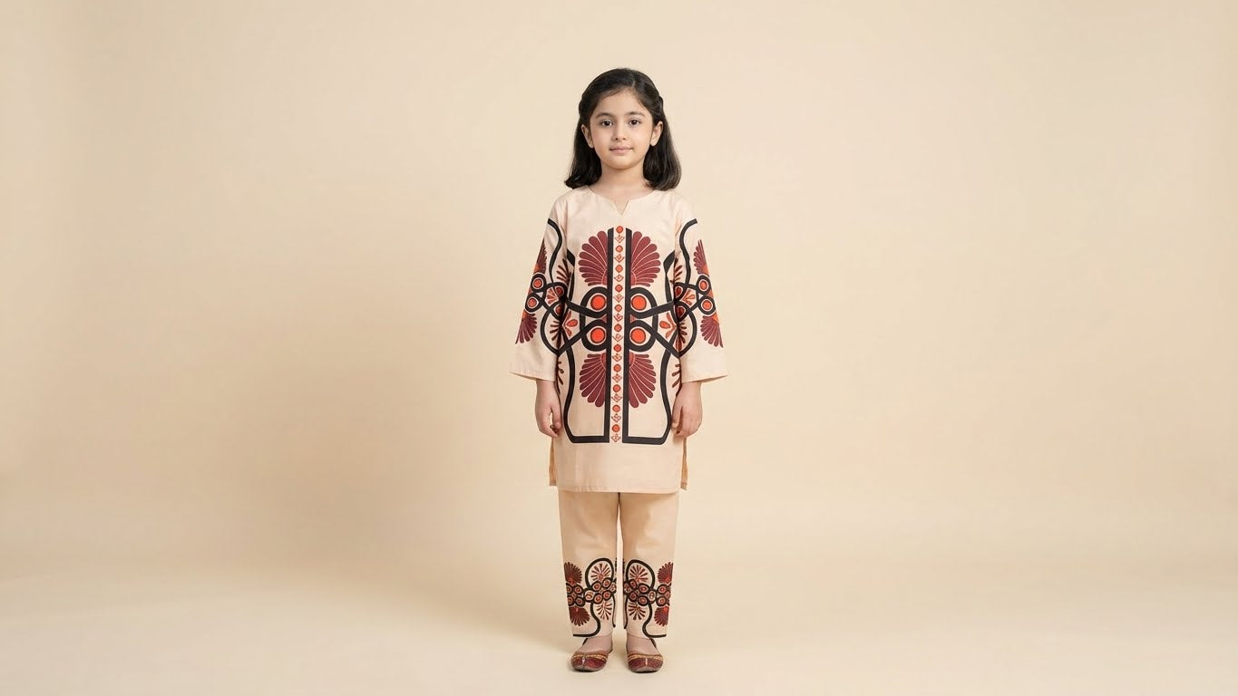 The Mihrab-e-Laleh suite is a striking blend of modern geometry and vintage floral symmetry. This cream-colored ensemble features a bold, centralized architectural motif in deep mahogany and burnt orange, reminiscent of traditional Persian archways.