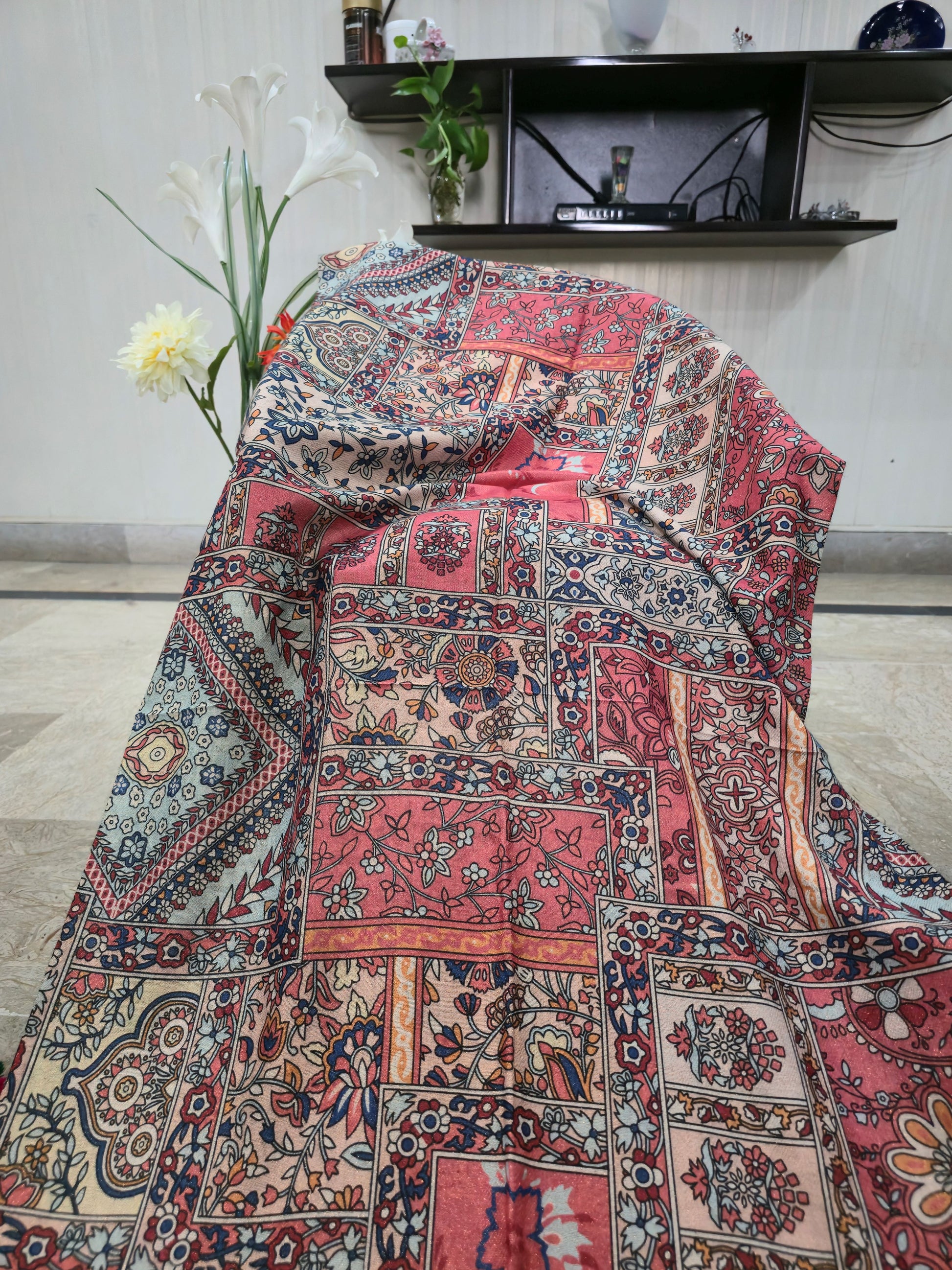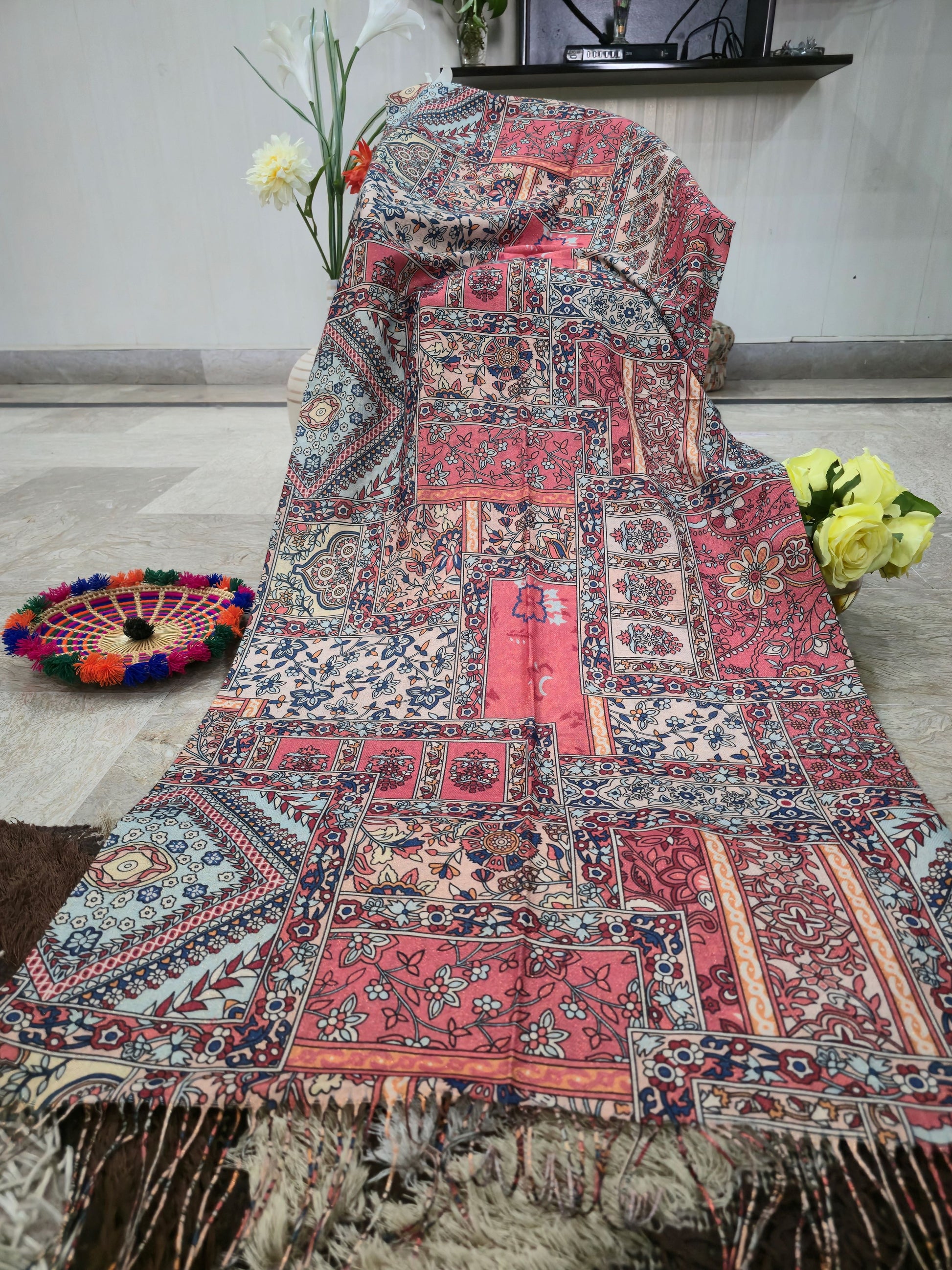 Crafted from a premium pashmina blend, this scarf features a beautifully detailed woven design in rich, multi-coloured motifs. Its bigger size allows for easy draping and versatile styling — perfect for both casual and formal occasions. The fabric is lightweight yet warm, making it ideal for all seasons, offering a graceful touch whether worn during breezy evenings or cool winter days.