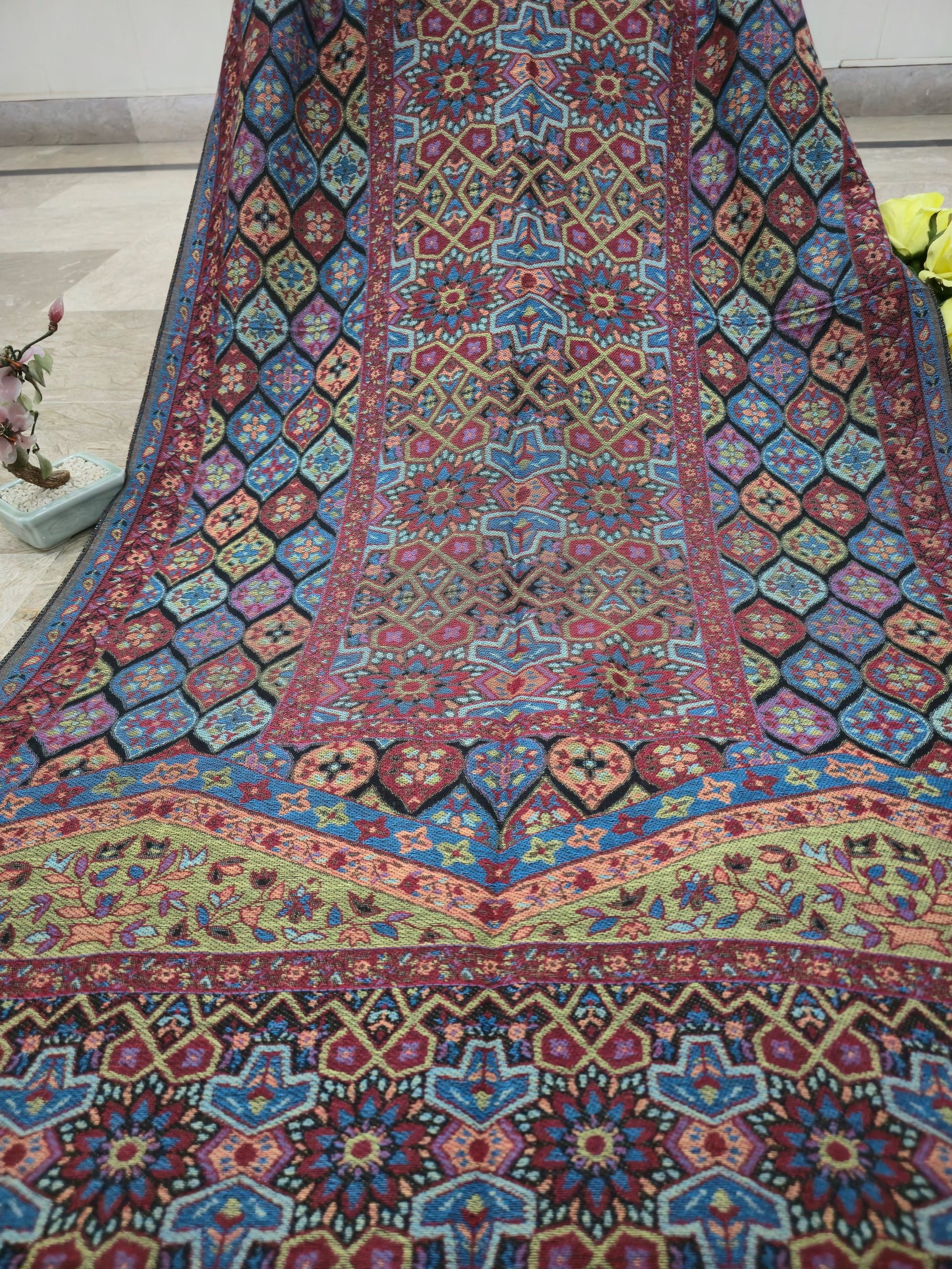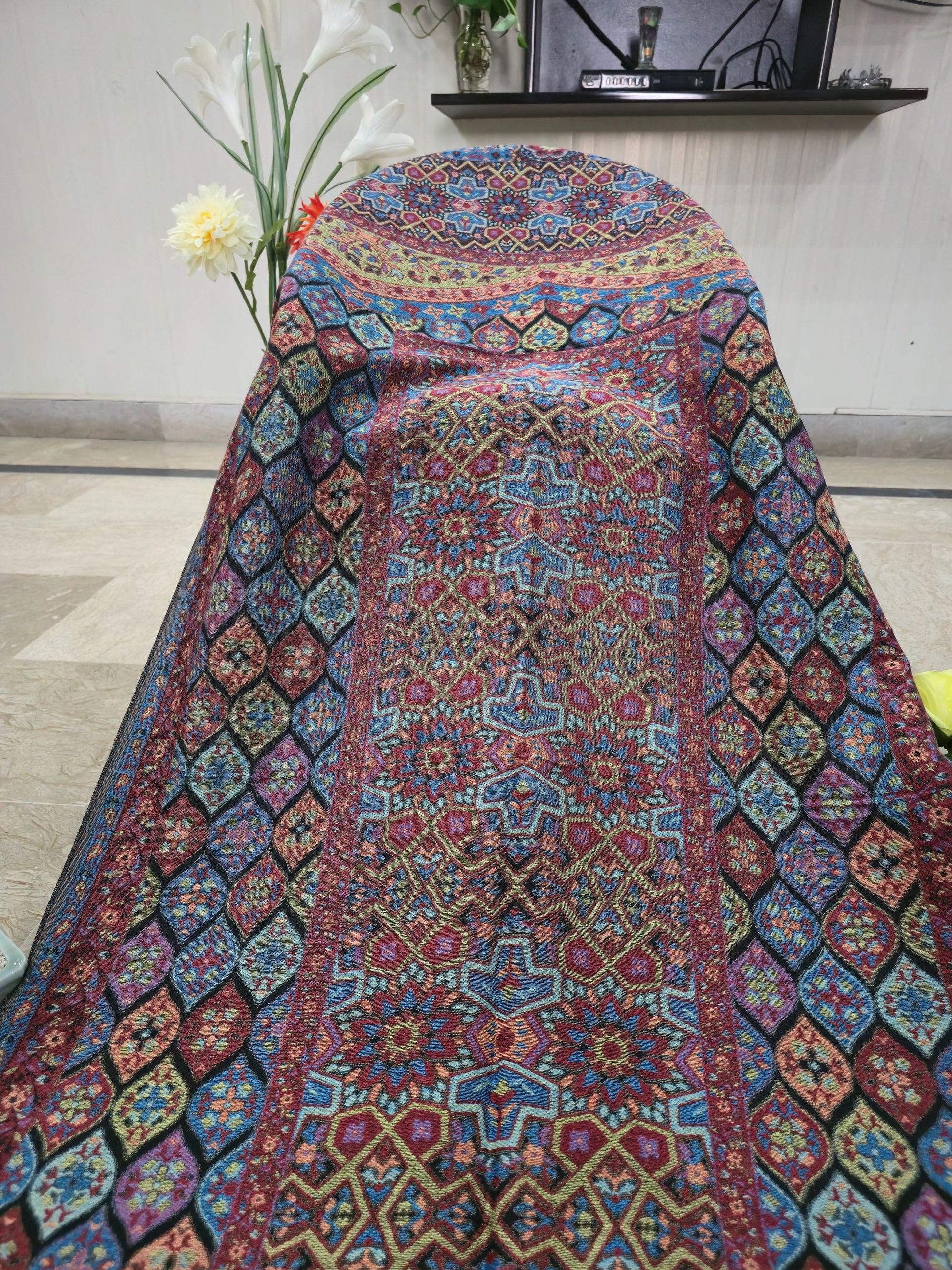 Crafted from a premium pashmina blend, this scarf features a beautifully detailed woven design in rich, multi-coloured motifs. Its bigger size allows for easy draping and versatile styling — perfect for both casual and formal occasions. The fabric is lightweight yet warm, making it ideal for all seasons, offering a graceful touch whether worn during breezy evenings or cool winter days.