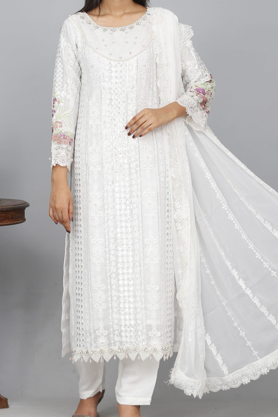 Elevate your festive and formal look with this exquisite 3-piece white ensemble from Style Up. Crafted in premium chiffon fabric, the outfit features a beautifully embroidered shirt — intricately designed on both the front and back to create a timeless, graceful appeal.