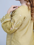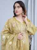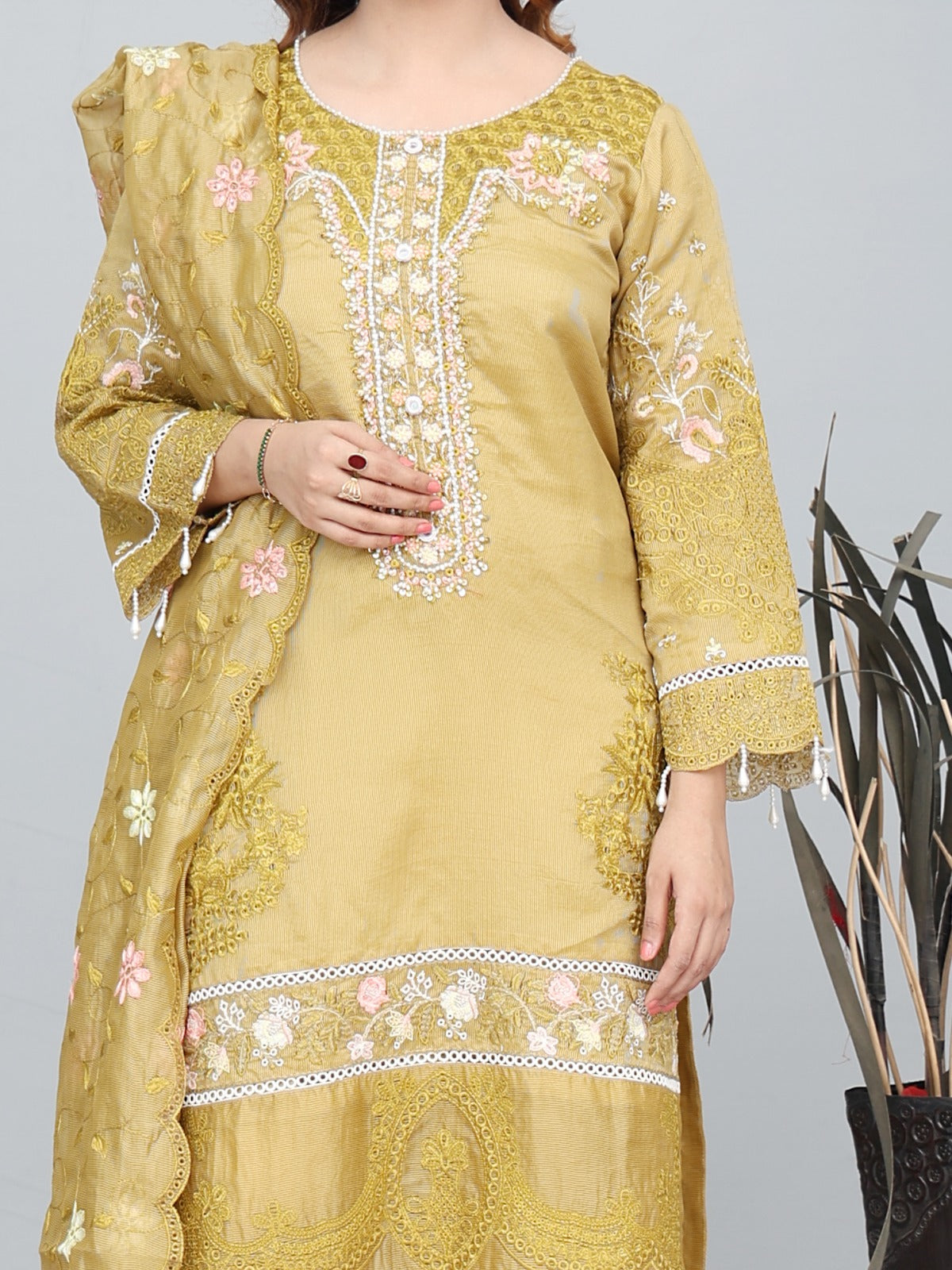 Step into timeless elegance with this exquisite 3-piece mustard organza Lining outfit, crafted to perfection with delicate thread and floral embroidery. The shirt features intricate detailing on the front, sleeves, and hemline — enhanced with lace finishing and tassel edging for a refined touch.