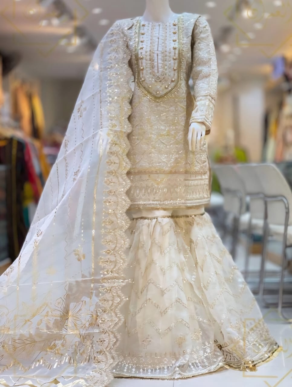 The look is completed with a fully embroidered organza dupatta that adds a luxurious touch, and a beautifully tailored gharara, making it a perfect choice for festive occasions, weddings, or formal celebrations.