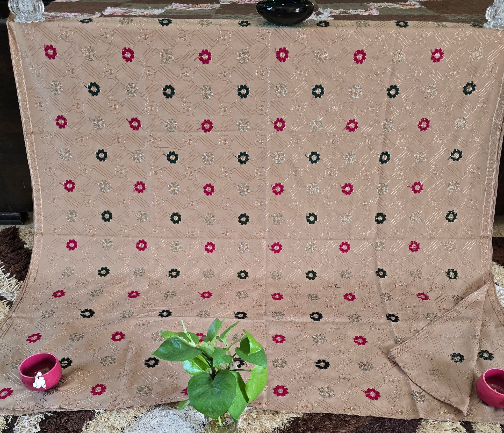 The rich base is beautifully adorned with delicate embroidery and finished with a graceful border, giving it a timeless and sophisticated appeal.