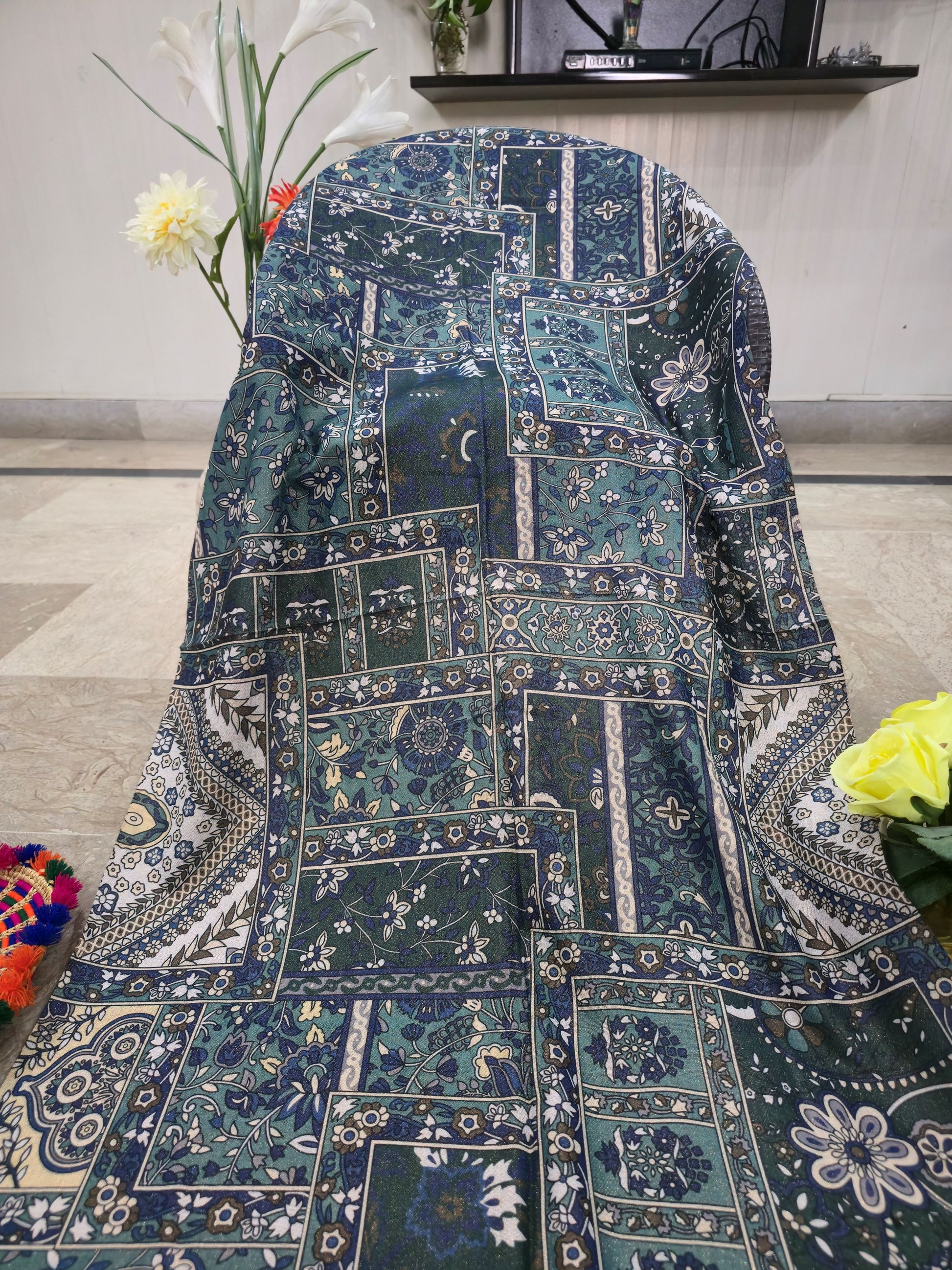 Crafted from a premium pashmina blend, this scarf features a beautifully detailed woven design in rich, multi-coloured motifs. Its bigger size allows for easy draping and versatile styling — perfect for both casual and formal occasions. The fabric is lightweight yet warm, making it ideal for all seasons, offering a graceful touch whether worn during breezy evenings or cool winter days.