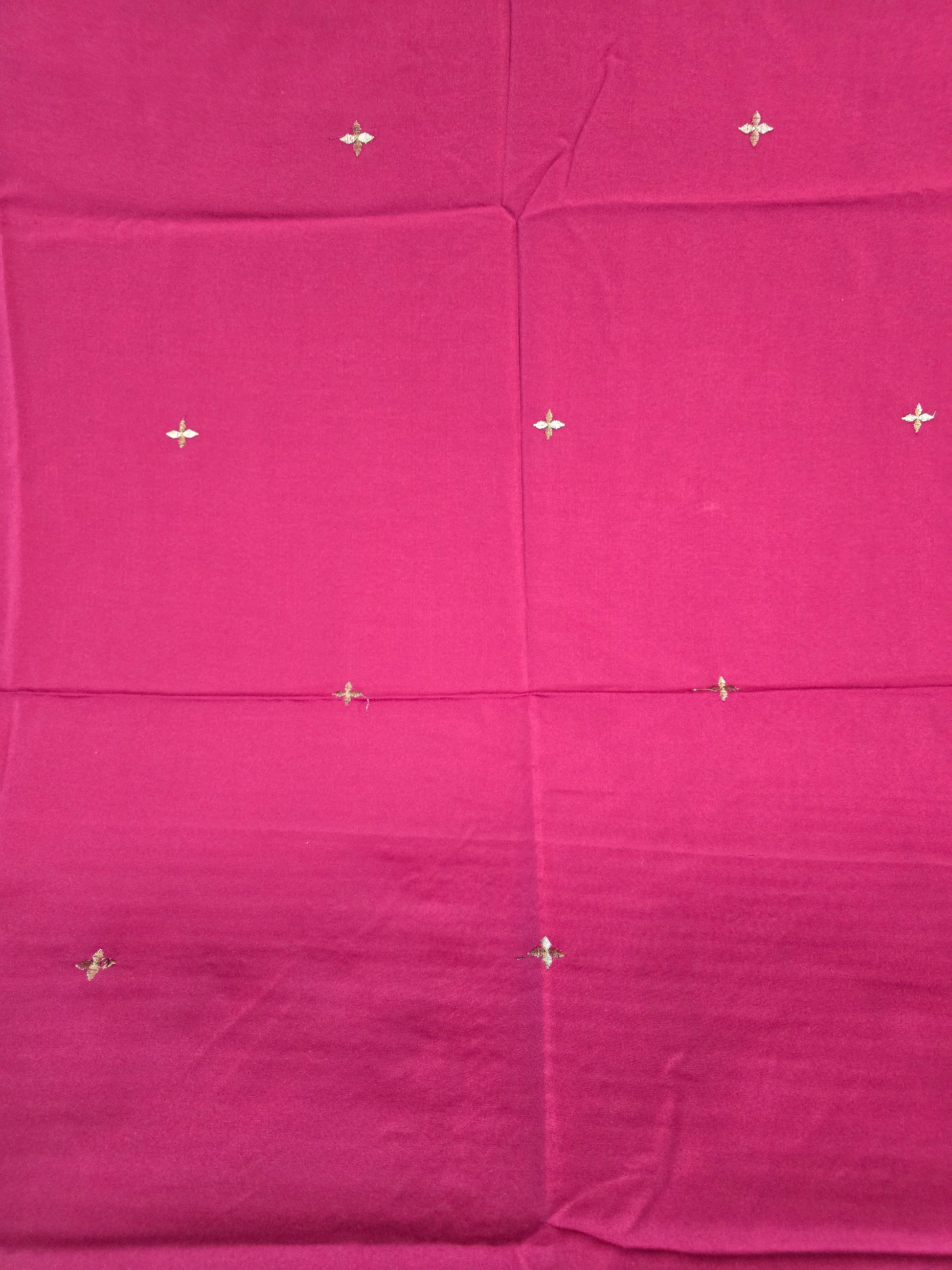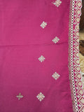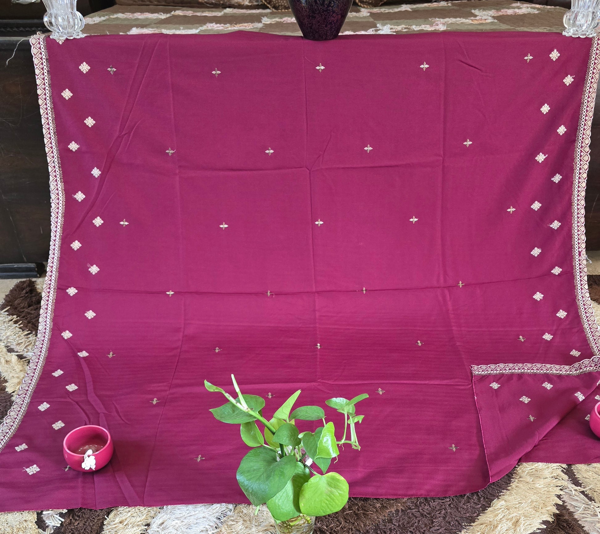 The rich maroon base is beautifully adorned with delicate embroidery and finished with a graceful border, giving it a timeless and sophisticated appeal.