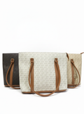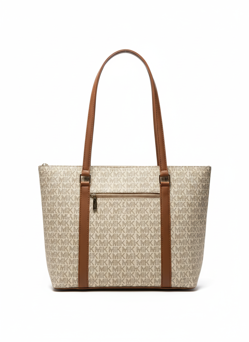 Elevate your professional style with the MK Monogram Work Tote from Style Up. This spacious shoulder bag features a sophisticated all-over monogram pattern in a neutral beige and tan, complemented by rich brown faux leather accents and comfortable shoulder straps. It's the perfect size for carrying your laptop, documents, and daily essentials with enduring style.