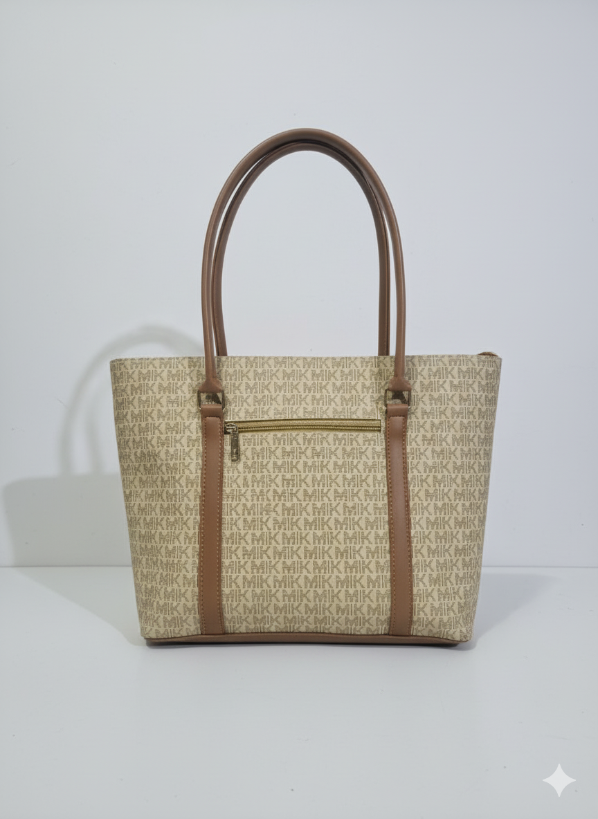 Carry your essentials with playful elegance! The MK Signature Charm Tote from Style Up features a versatile all-over monogram pattern in a classic beige and tan colorway. The rich brown faux leather accents and comfortable shoulder straps frame this spacious tote perfectly. A stylish gold-tone chain and black heart charm add a unique, eye-catching detail that sets this bag apart.