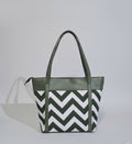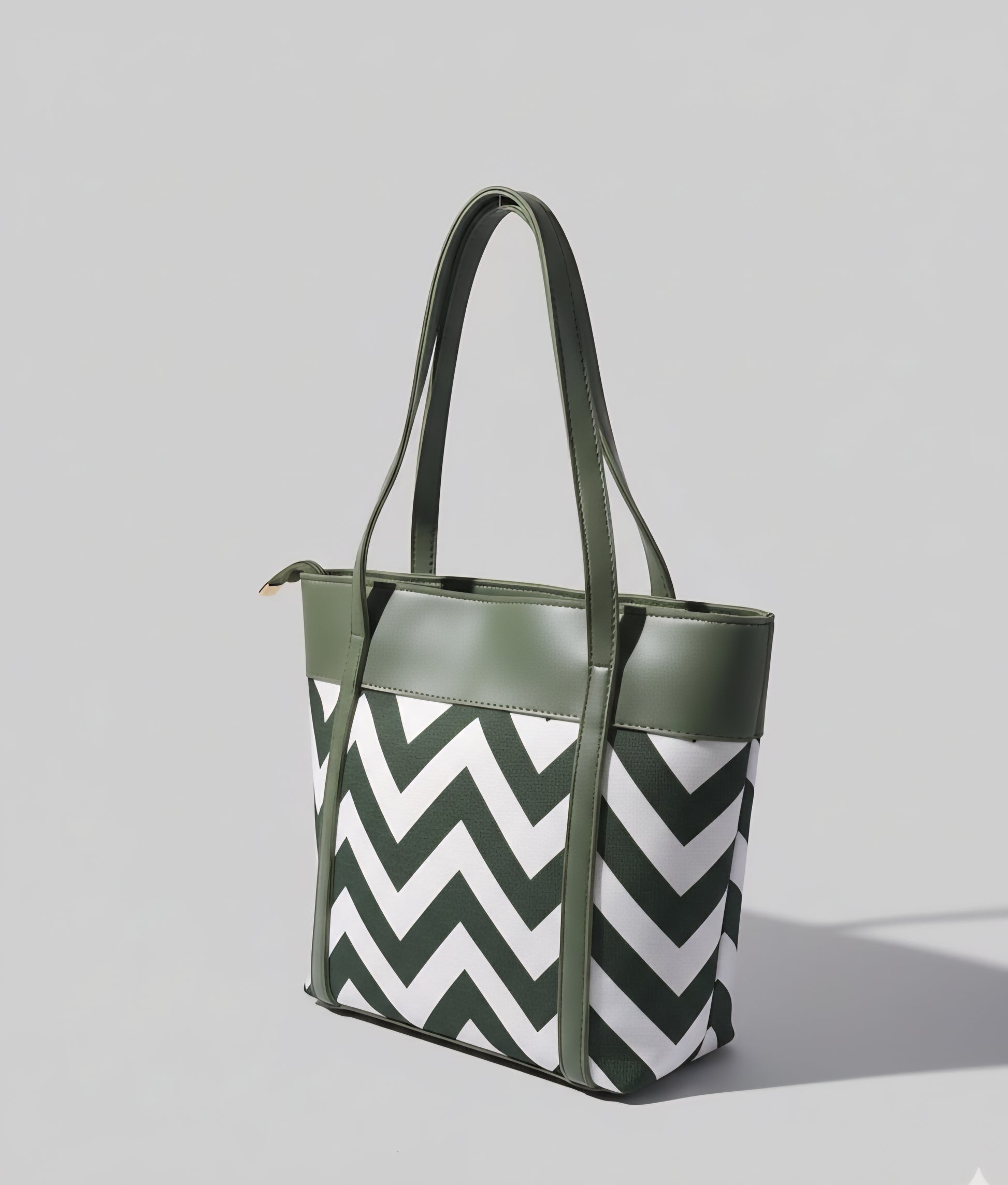 Featuring a crisp olive-green and white chevron pattern, this structured tote is framed by smooth, matching olive-green faux leather trim and handles. This color combination is both refreshing and wonderfully versatile, adding a subtle pop of color without overpowering your look. The spacious interior and comfortable shoulder straps make it the perfect everyday companion, whether you're heading to the market or the office.