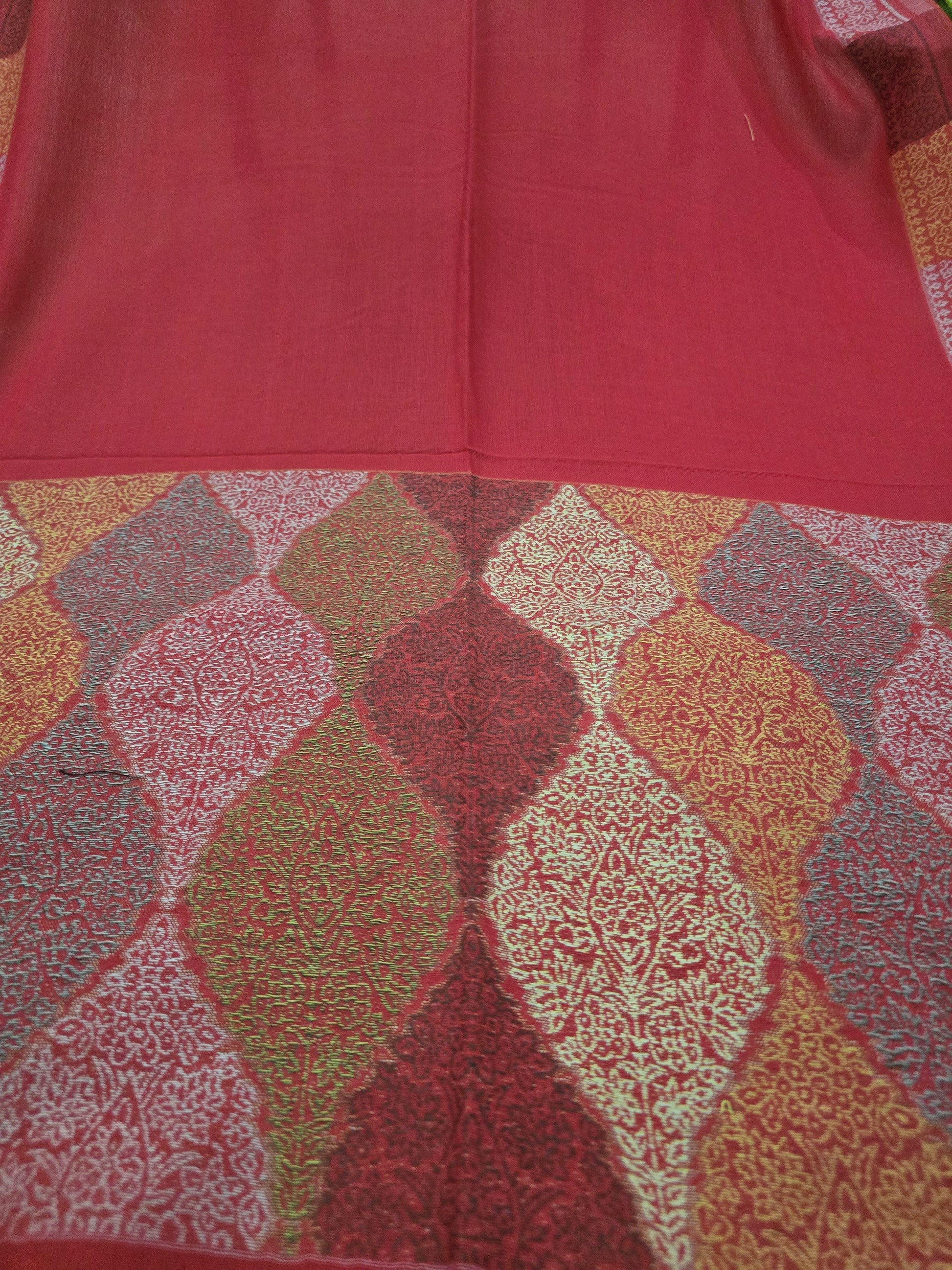 Crafted from a premium pashmina blend, this scarf features a beautifully detailed woven design in rich, multi-coloured motifs. Its bigger size allows for easy draping and versatile styling — perfect for both casual and formal occasions. The fabric is lightweight yet warm, making it ideal for all seasons, offering a graceful touch whether worn during breezy evenings or cool winter days.
